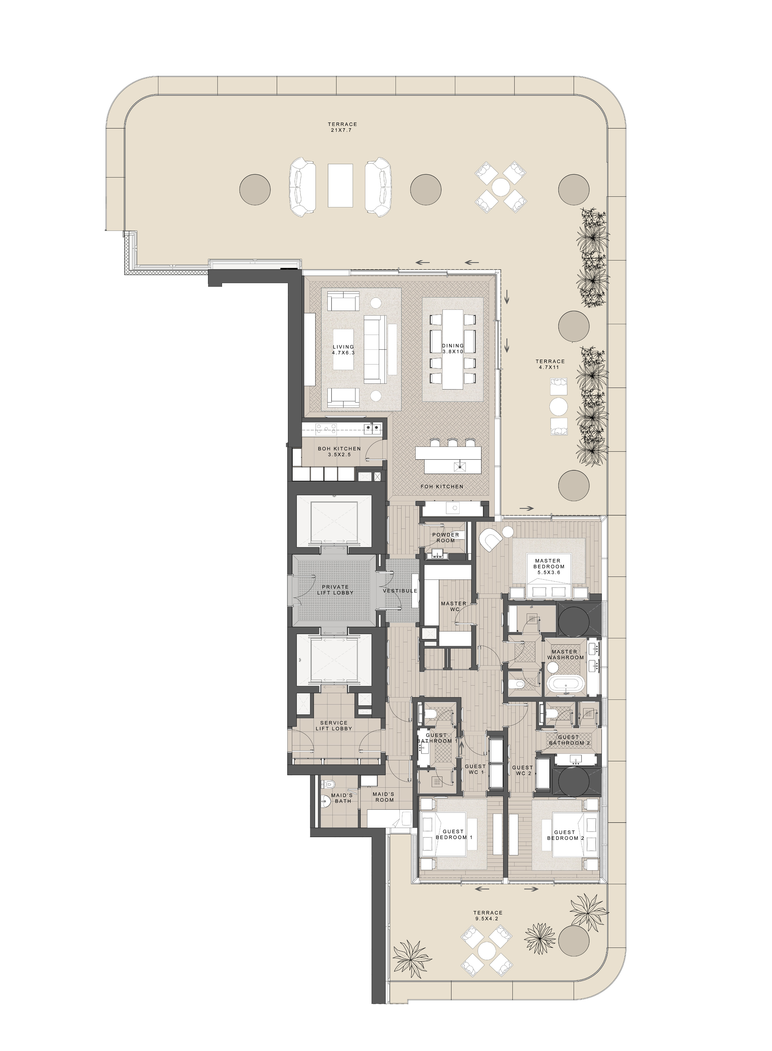 Each residence is fully furnished and curated with meticulous attention to detail. Select homes feature private pools, expansive terraces, and double-height living areas that open to breathtaking views of Marasi Bay. The Skybridge Duplexes and Celestial Penthouses crown the tower with unmatched grandeur — where polished stone, rich woods, and tactile metals create a sanctuary of understated luxury. Every detail reflects serenity, precision, and timeless design.