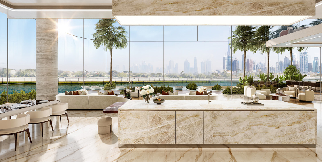 Designed by Shaun Killa of Killa Design — the visionary behind Dubai’s Museum of the Future — Casa AHS is a sculptural masterpiece of glass, steel, and stone that mirrors the graceful flow of the canal. Sunlight dances across its curved façade, creating a dynamic play of reflection and texture. Interiors by HBA Residential evoke refined modernity and timeless beauty, where double-height ceilings, sweeping glass walls, and bespoke finishes turn every home into a sanctuary of elegance.